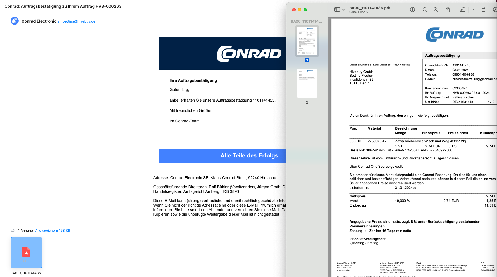 Sie sollten ca. 24h später von Conrad eine Bestätigungsmail erhalten